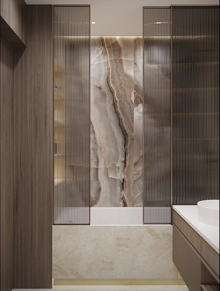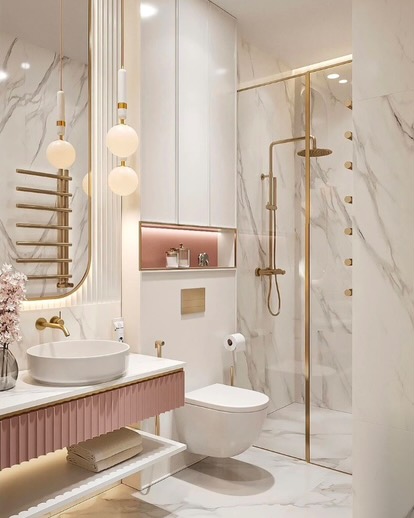 Acest design interior reinterpretează eleganța modernă prin combinarea marmurei albe cu accente aurii sofisticate și detalii subtile în tonuri blush, rezultând un spațiu armonios și rafinat. Iluminatul LED integrat și corpurile de iluminat suspendate evidențiază texturile premium, conferind un aer de eleganță discretă.