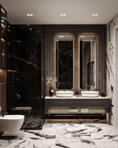 Spațiul este definit de contrastul spectaculos dintre marmura neagră cu vene dramatice și panourile calde din lemn, creând o atmosferă de rafinament sofisticat. Suprafețele lucioase reflectă iluminatul ambiental, amplificând senzația de adâncime și lux.