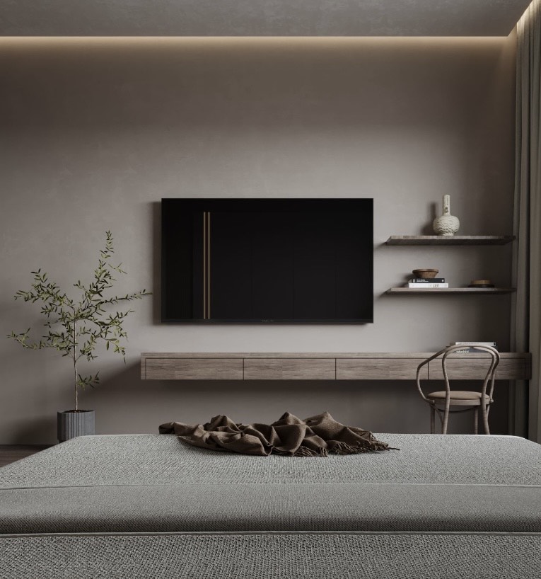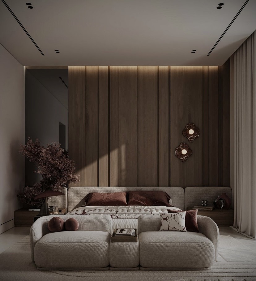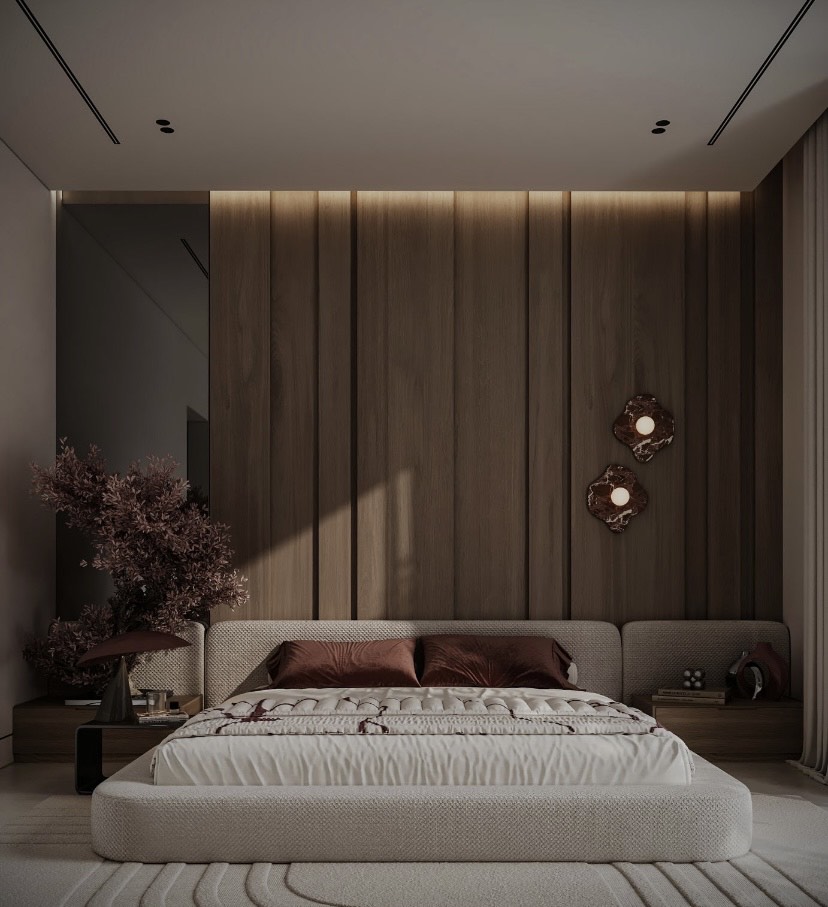 Lemnul natural este folosit pentru peretele accent, aducând căldură și textură.Textile moi și luxoase precum pernele și cuvertura contribuie la confortul vizual și tactil.Suprafețele mate și netede păstrează estetica minimalistă.
