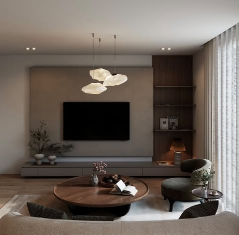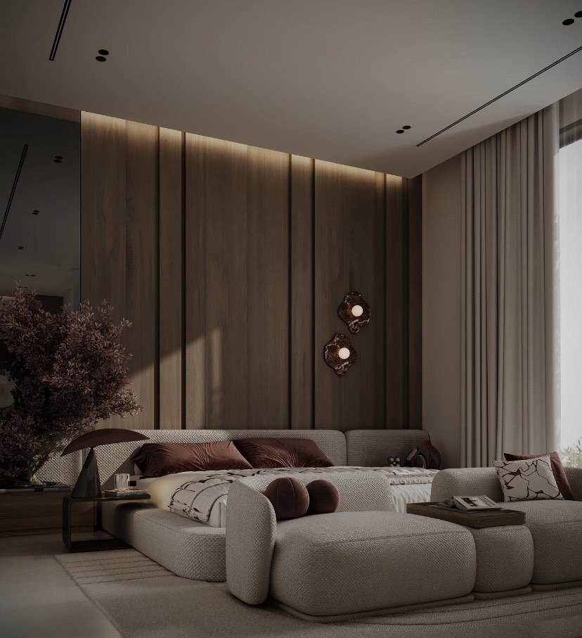 Paleta de culori, dominată de nuanțe calde de bej, crem și lemn deschis, creează o senzație de calm și armonie. Texturile naturale — piatră, lemn, textile moi — îmbogățesc spațiul cu căldură tactilă și lux discret.
