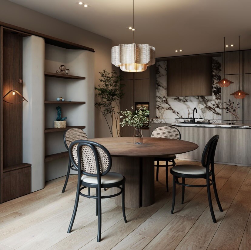 Proiectul reflectă o estetică rafinată: proporții echilibrate și o atmosferă caldă și elegantă. Spațiul open-concept a fost conceput astfel încât funcționalitatea să se îmbine perfect cu sofisticarea atemporală.