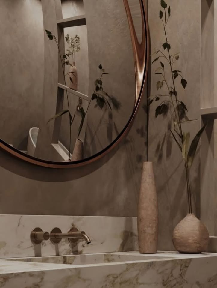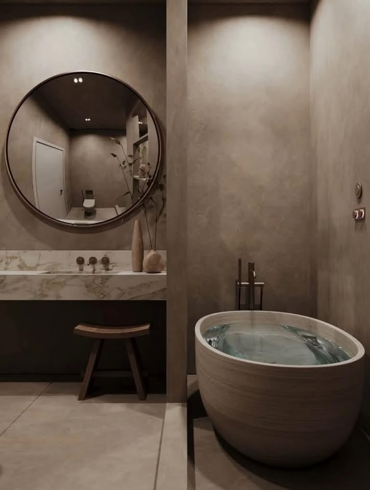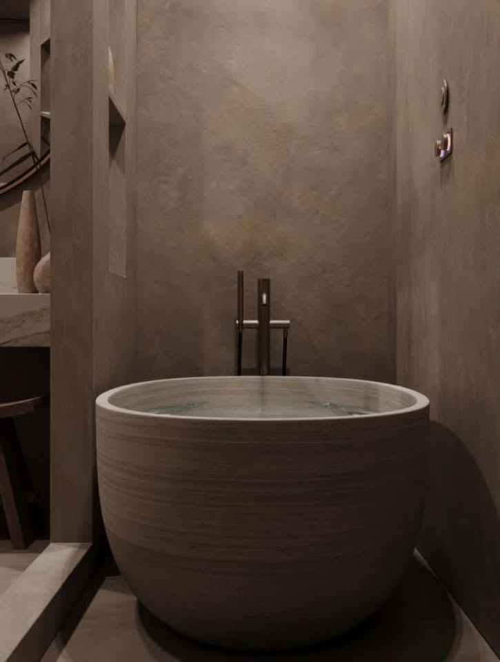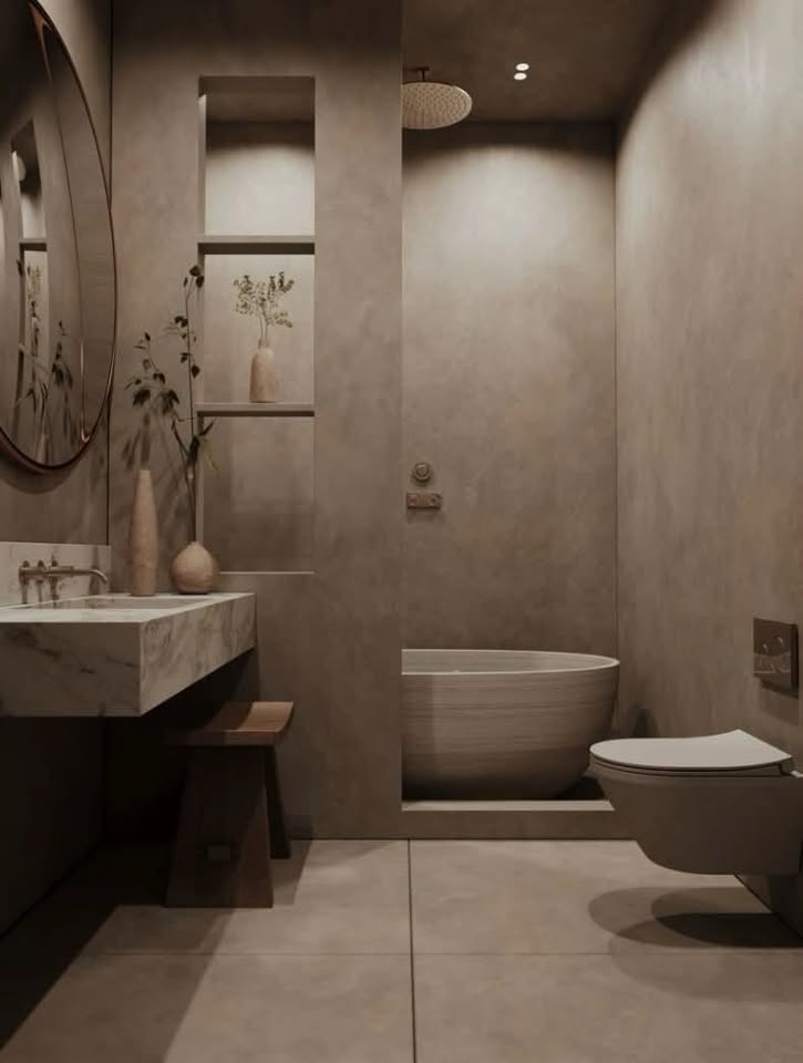 This interior design project explores the subtle dialogue between modern brutalism and organic warmth. The space is conceived as a monochromatic sanctuary, where visual barriers are removed to make room for a profound sensory experience. The continuous texture of the microcement walls creates a visual unity that transforms the room into a sculpted whole, rather than just a collection of objects.