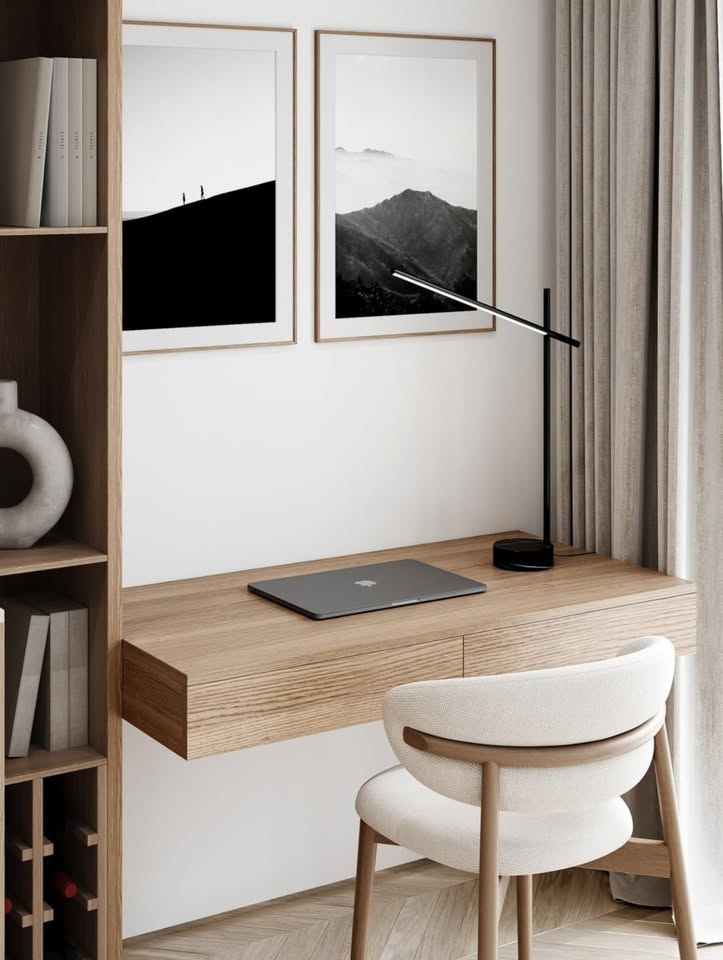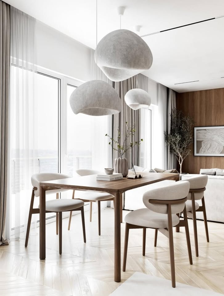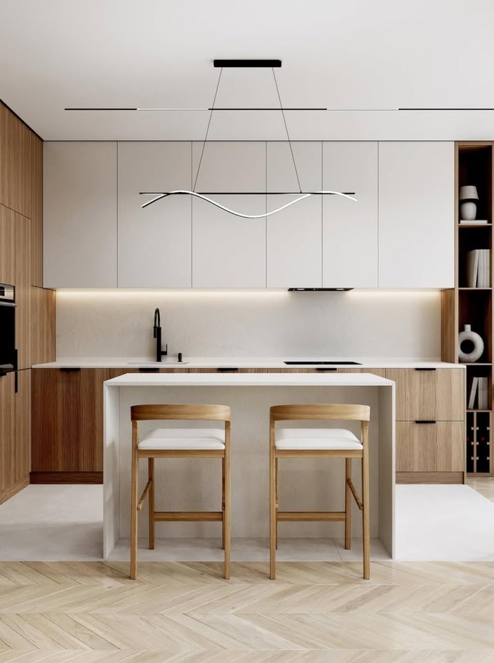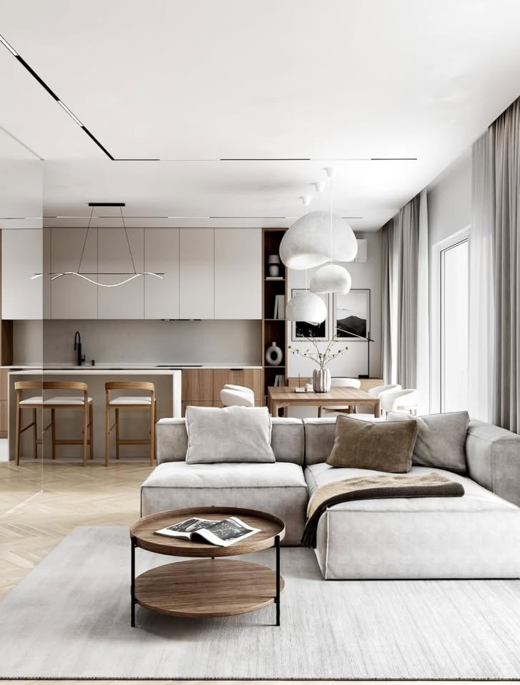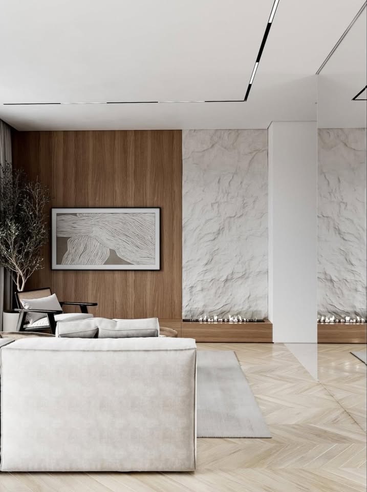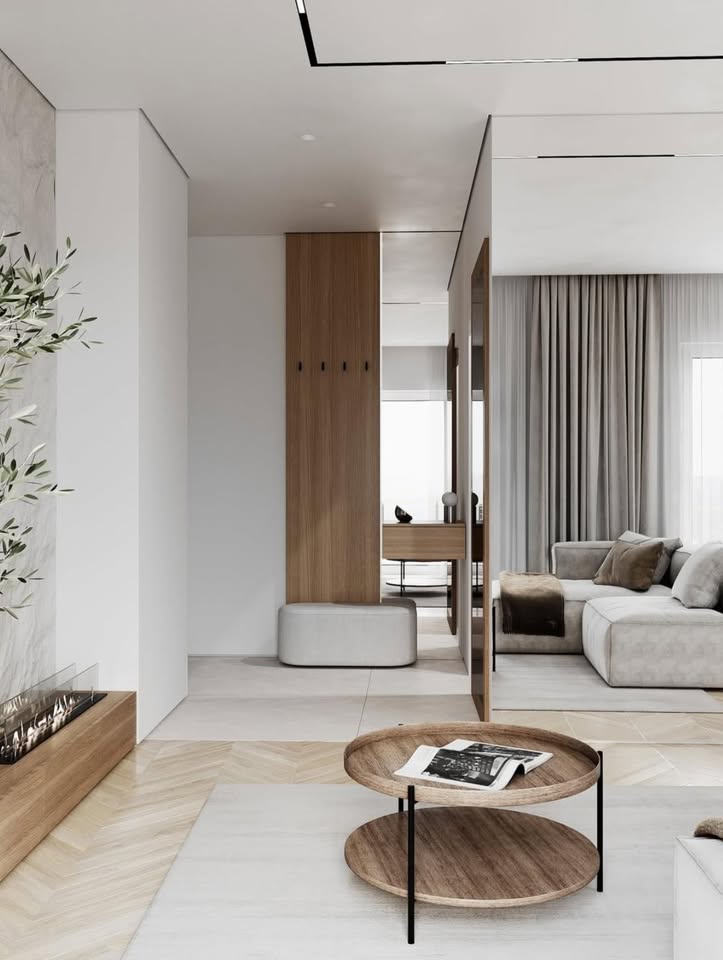 This interior design project redefines contemporary minimalism through a neutral color palette and the use of natural materials. The rich texture of oak wood blends harmoniously with warm grey and white tones, creating an atmosphere of calm and visual continuity throughout every room.